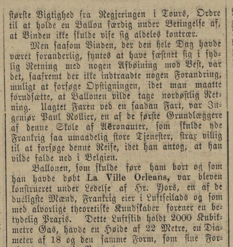 «Men saasom Vinden, der den hele Dag havde været foranderlig, syntes at have fæstnet sig i sydlig Retning med nogen Afbøjning mot Vest, var det, saafremt der ikke indtraadte nogen Forandring, muligt at forsøge Opstigningen, idet man maatte forudsette, at Ballonen vilde tage nordøstlig Retning. Uagtet faren ved en saadan Fart, var Ingeniør Paul Rollier, en af de første Grundlæggere af denne Skole af Aeronauter, som skulde yde Frankrig saa umaadelig store Tjenester, strax villig til at forsøge denne Reise, idet han antog, at han vilde falde ned i Belgien»