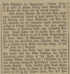 Ikke bare nasjonalbiblioteket [podcast sept. 2020 – se under] har de siste måneder blåst liv i den 150 år gamle beretningen om den franske gassballongen «La Ville d’Orleans» – som kom ut av kurs på vei ut fra det beleirede Paris, 24. november 1870 – og som etter mange timers reise nordover krasjlandet i Norge.  Også NRKprogrammet ‘Ekko’ formidlet beretningen på fengslende vis, med mange interessante innspill, gjennom to sendinger 29. og 30. oktober 2020 [L]