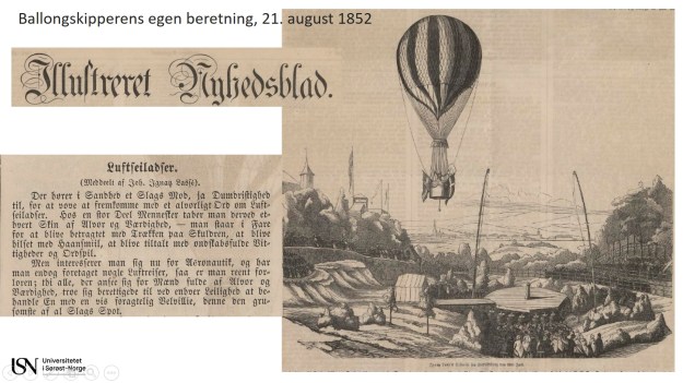 25. juli og 1. august 1852. Han beskriver grundig de praktiske forberedelsene, bl.a. produksjon av hydrogengassen til fylling av ballongen: «[…] Fyldningen med Vandstofgas. Dertil udfordres først og fremst fortrinligt, reent og ikke haardt Vand, godt porøst Jern og Vitriololje eller Svovelsyre, der holder bestemte Grader