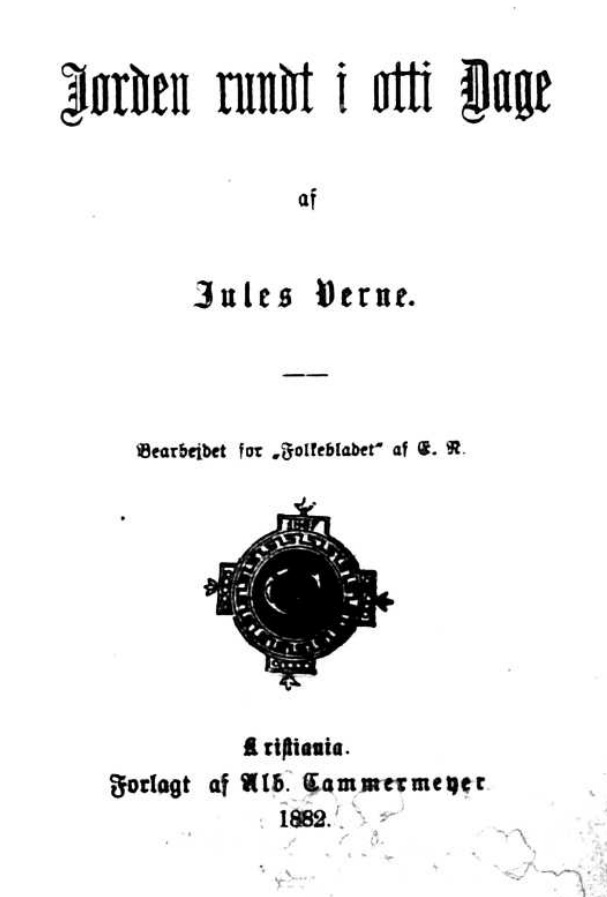 [NB: I ulike sammenhenger kan man støte på bibliografiske opplysninger om ‘Jorden rundt på 80 dager’ som overser denne meget tidlige oversettelsen til norsk fra Cammermeyer. Tilsvarende utelatelse gjelder også ‘Avisens føljeton’ fra Nikolai Olsens bogtrykkeri 1897 Jorden rundt i 80 dage som er annen, selvstendig oversettelse (v/ D.Vindheim) trykket i Norge.