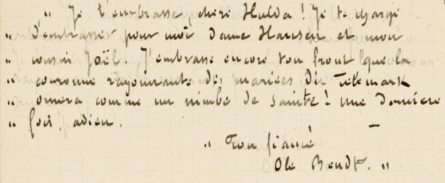 «la fiancée de Ole était charmante avec cette physionomie un peu mélancolique des filles du Nord, mais souriante aussi. En la voyant, on songeait volontiers à cette Hulda la Blonde, dont elle portait le nom, et que la mythologie scandinave laisse errer, comme la fée heureuse, autour du foyer domestique.»