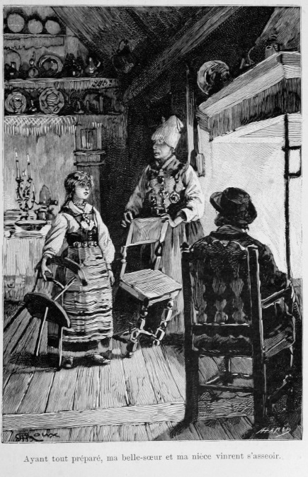 En meget talende illustrasjon viser her (vel å merke kun i komplette utgaver – utrolig nok ikke gjengitt i de fleste norske) hvordan Aronnax, Land og Conseil blir tatt hånd om av en norsk fiskerfamilie. På bildet ser vi hvordan de får i seg styrkende drikke, angivelig i et naust i vannkanten der det fra taket henger garn og fisk til tørk.