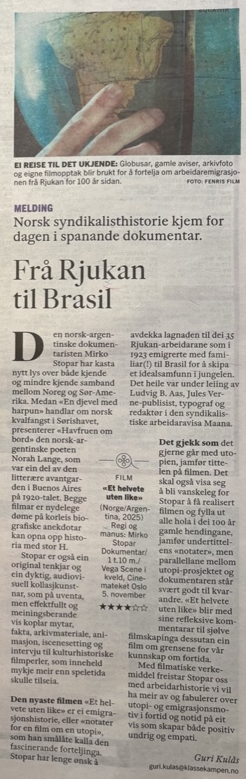 Stopar har lenge ønsk å avdekke lagnaden til dei 35 Rjukan-arbeidarane som i 1923 emigrerte med familiar (!) til Brasil for å skipa et idealsamfunn i jungelen. Det heile var under leiing av Ludvig B. Aas, Jules Verne-publisist, typograf og redaktør i den syndikalistiske arbeidaravisa Maana»