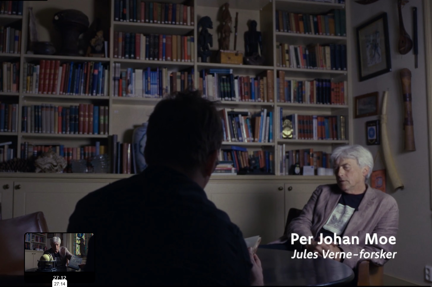I en sekvens samtaler filmskaper Mirko Stopar med Jules Verne-forsker Per Johan Moe i bibliotek/skrivestue: